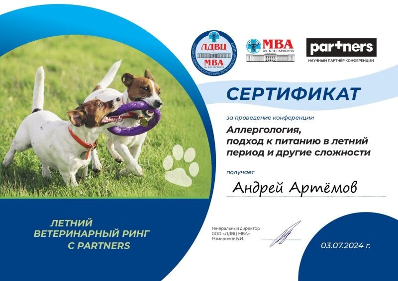- MTU VetClub, вебинар «Нежелательные пищевые реакции у собак и кошек: концептуальный подход», 2024 г.