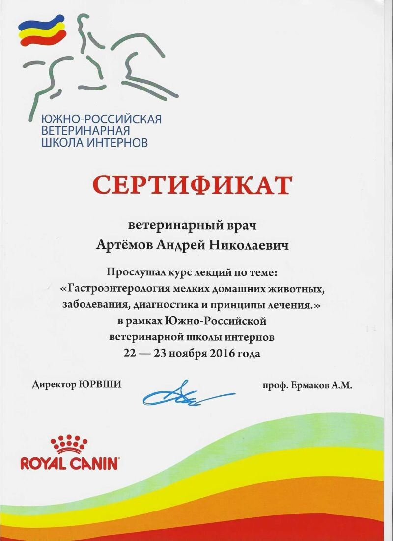 - Южно-Российкая ветеринарная школа интернов, курс лекций «Гастроэнтерология мелких домашних животных, заболевания, диагностика и принципы лечения», 2016 г.
