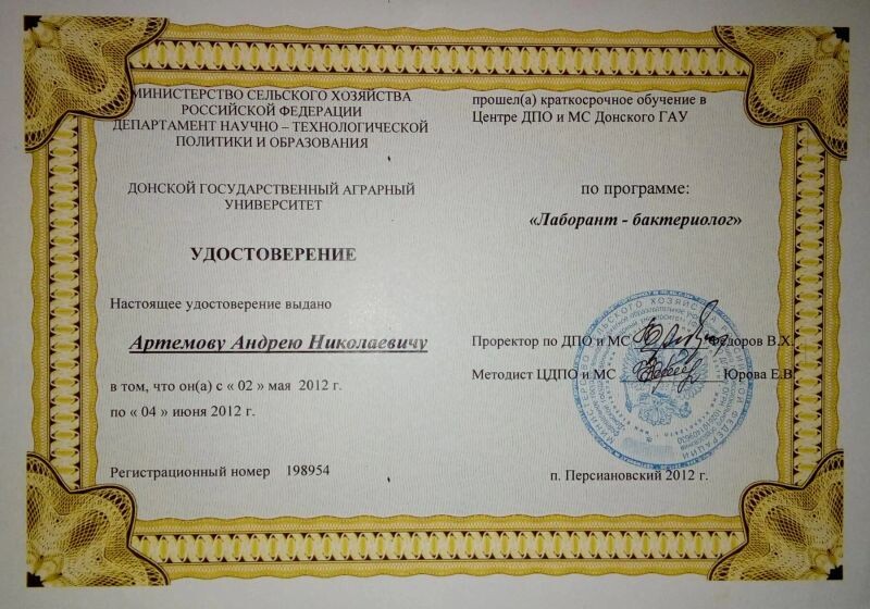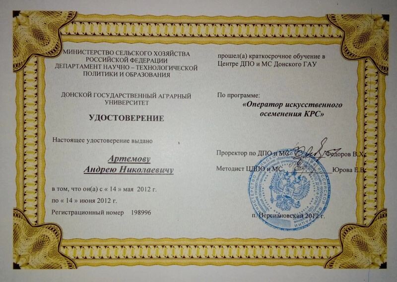 - ДПО и МС Донской государственный аграрный университет, оператор искусственного осеменения, 2008–2012 гг.