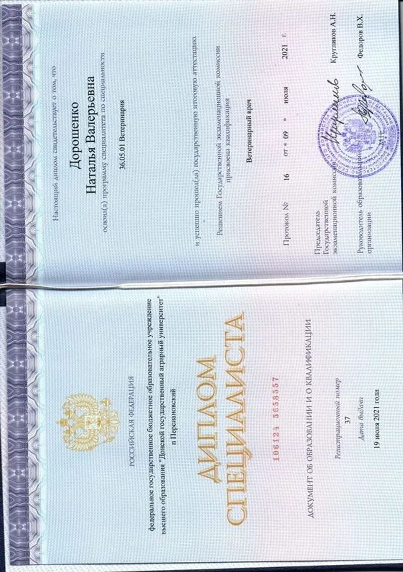 - Донской государственный аграрный университет, факультет ветеринарной медицины, специализация — ветеринария, 2016–2021 гг.