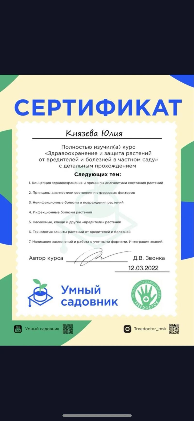- Умный садовник, Treedoctor, курс «Здравоохранение и защита растений от вредителей и болезней в частном саду», 2022 г.