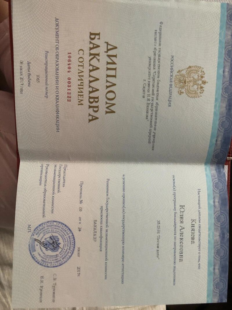 - ФГБОУ ВО «СГАУ им Н.И. Вавилова», направление «Природообустройство и лесное дело», 2013–2017 гг.