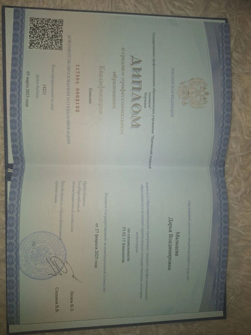 - Нерчинский аграрный техникум, кинолог, 2021–2025 гг.