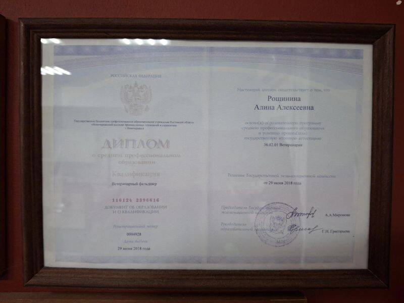 - ГБПОУ РО «Новочеркасский колледж промышленных технологий и управления», ветеринария, 2013–2018 гг.
