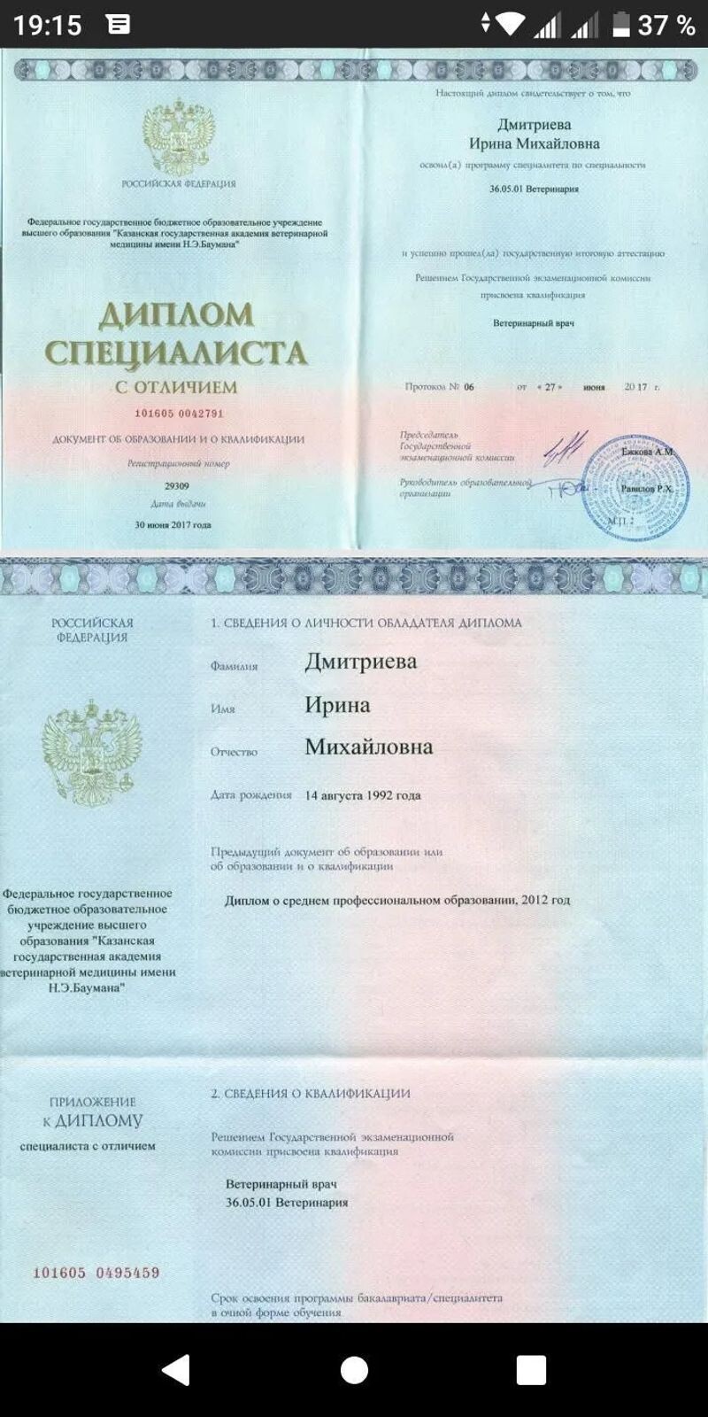 - Казанская государственная академия ветеринарной медицины имени Н.Э. Баумана, ветеринарный врач, 2012–2017 гг.