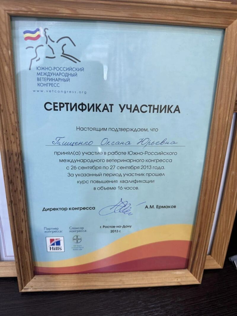 - Южно-Российский международный ветеринарный конгресс, участник, 2013 г.