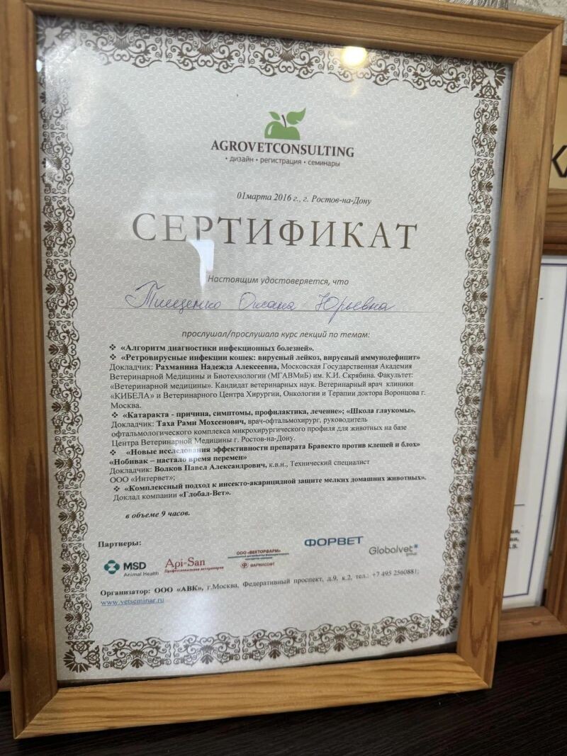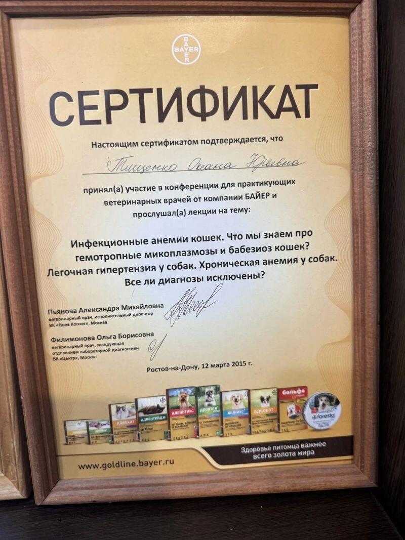 - Bayer, участие в конференции для практикующих ветеринарных врачей, лекции по различным заболеваниям кошек и собак, 2015 г.