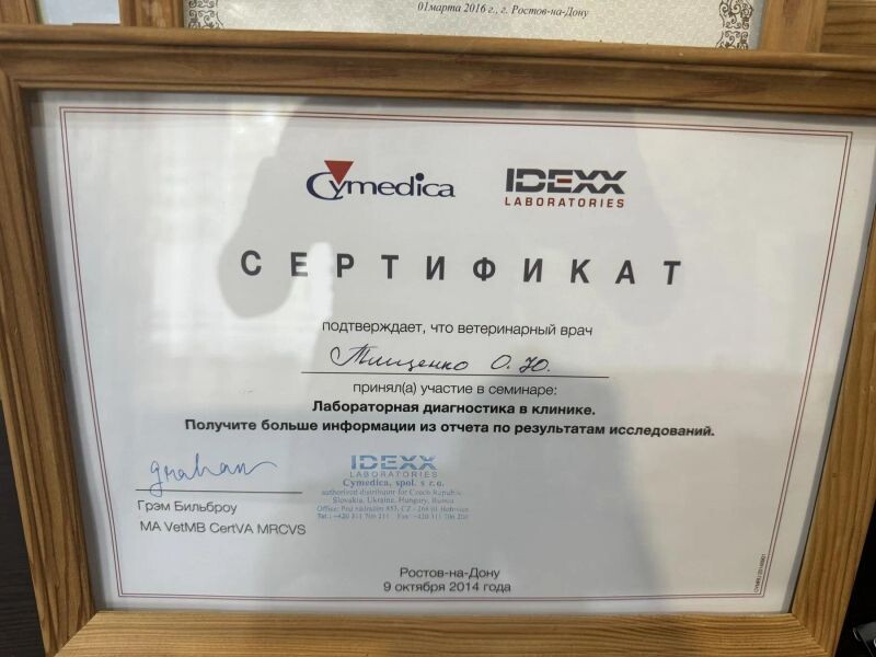 - Cymedica, IDEXX Laboratoies, семинар «Лабораторная диагностика в клинике. Получите больше информации из отчёта по результатам исследований», 2014 г.