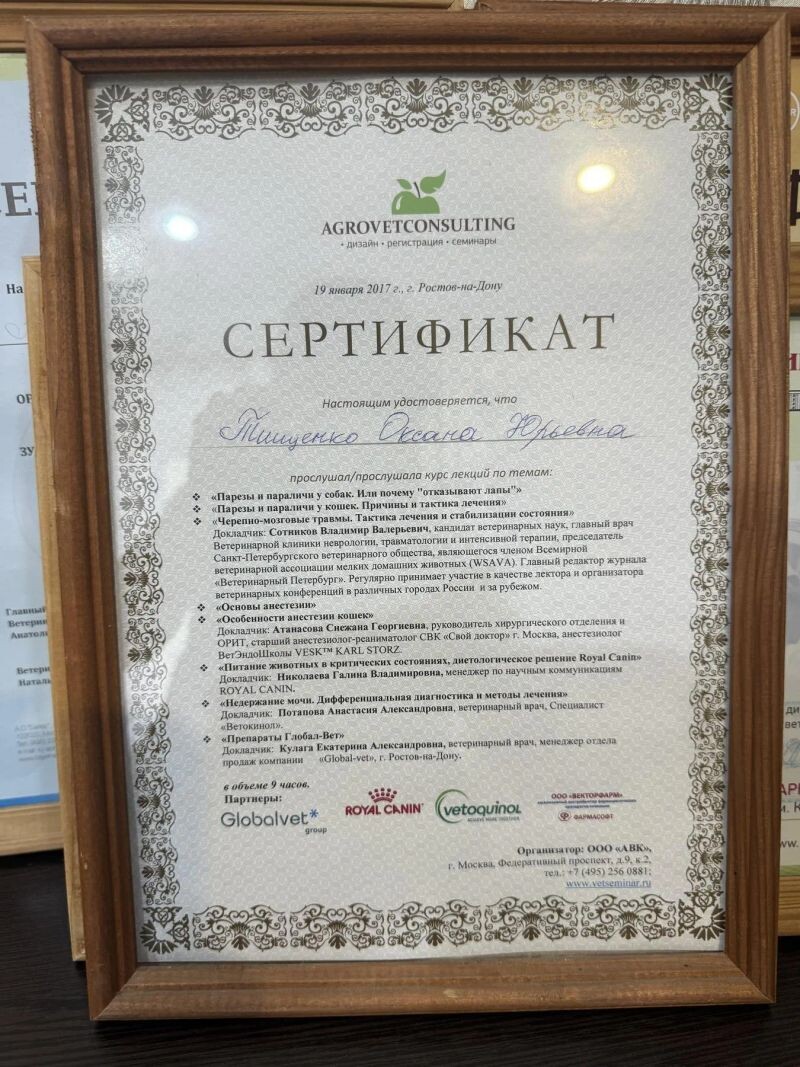 - AgroVetConulting, курс лекций по неврологическим заболеваниям и травмам животных, их диагностике и методам лечения, 2017 г.