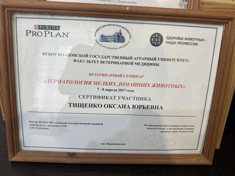 - Донской государственный аграрный университет, ветеринарный семинар «Дерматология мелких домашних животных», 2017 г.