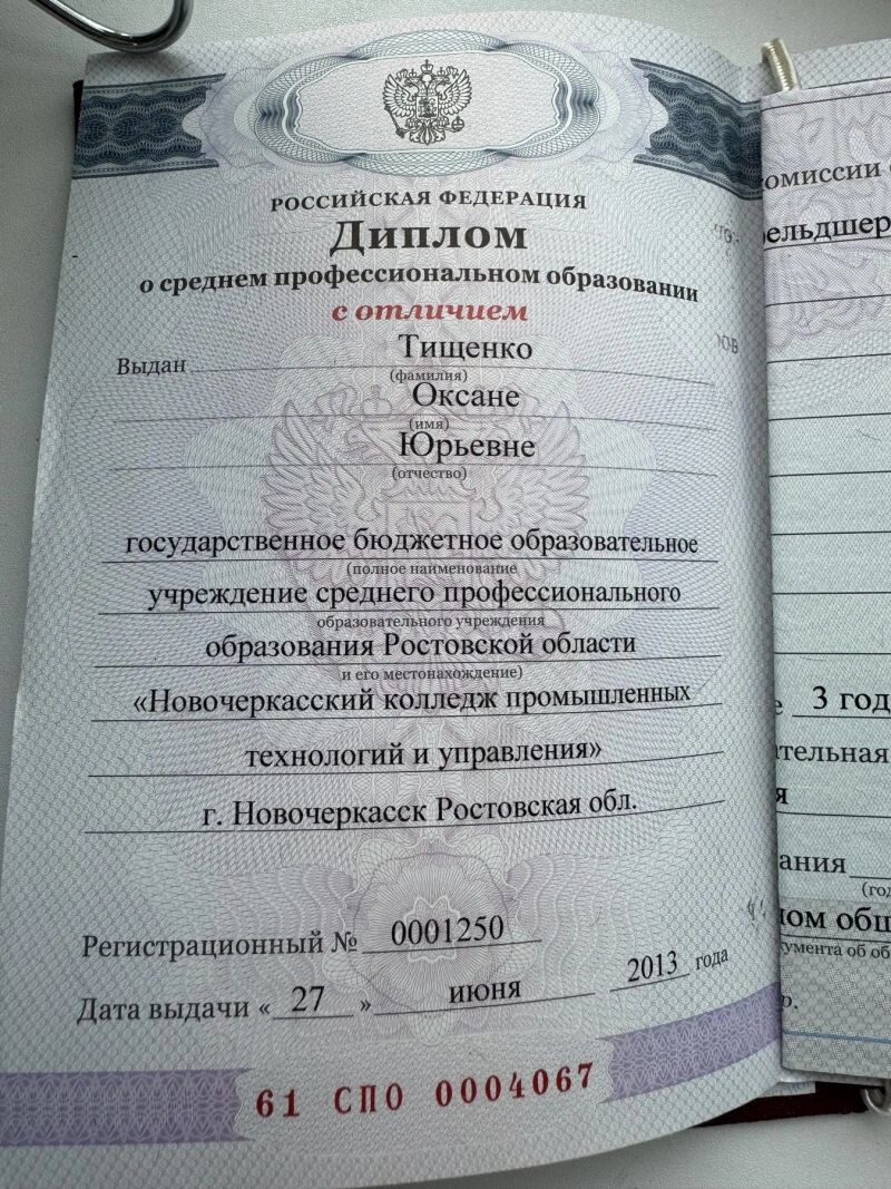 - Новочеркасский колледж промышленных технологий и управления, ветеринарный фельдшер, диплом с отличием, 2009–2013 гг.